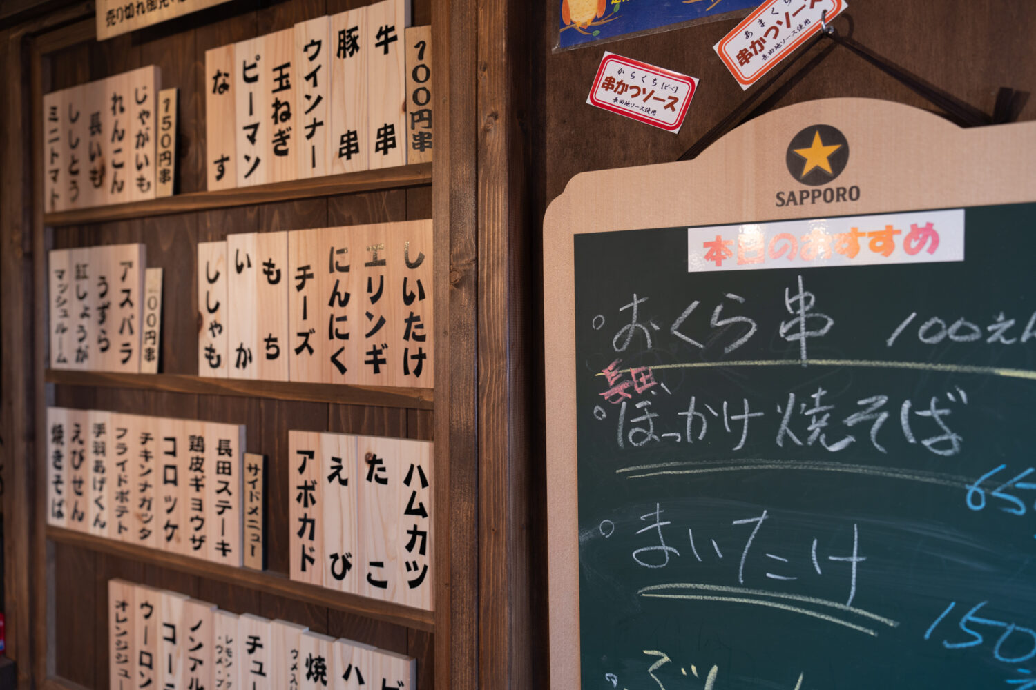 ▼店内に並ぶメニュー、おすすめのぼっかけ焼きそば