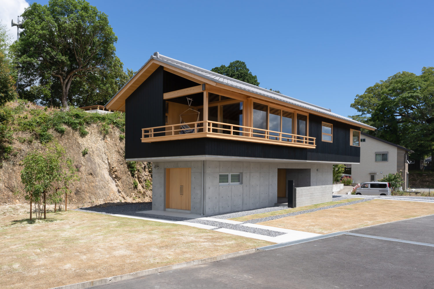「今回の土地は崖条例に入ってましたので、1階はコンクリート仕上げで窓を開けられません。だったらコンクリートで1階を全部持ち上げようというのが始まりで、デザインではなく、なるべくしてコンクリートになりました。1階がコンクリートだと、2階の方が大きくても持たすことが出来るので基本的な生活すべてを2階に出来るプランにしました。」