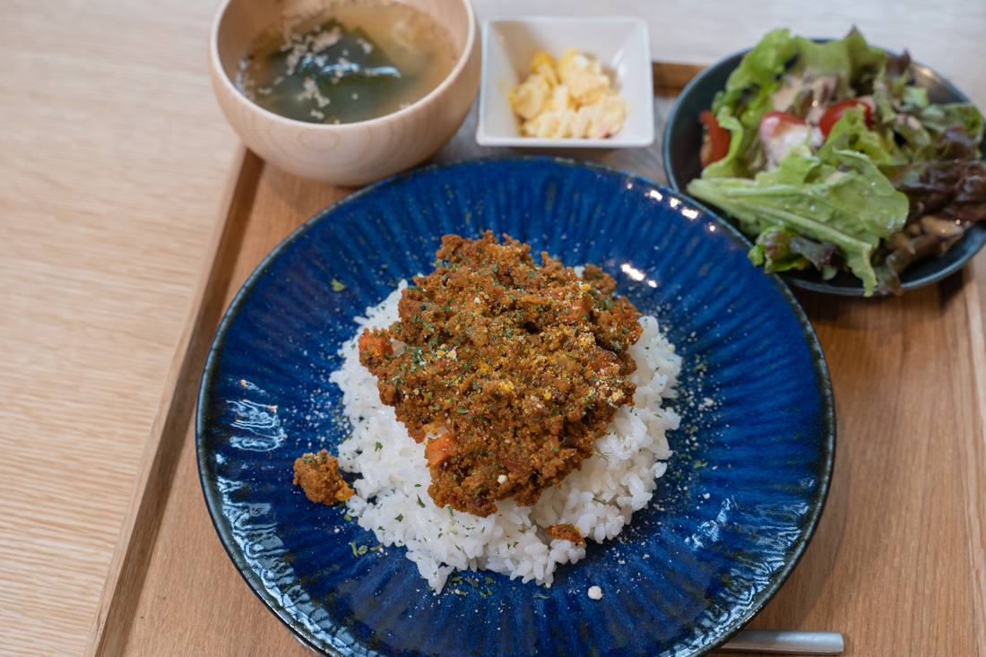 「カフェをやると決まってから東京にいる時に知り合った人がカレー屋さんをしていて、カフェをやるならカレーのレシピを教えてあげると言ってくれて。骨付きの肉から煮込んで出汁を取って作るカレーだったんですけど、かなりパンチの利いた味だったんです。こっちで色んな人に食べてもらったら好みが分かれたので、スパイスはそのままでキーマにアレンジして食べやすい味のカレーに仕上げました。」