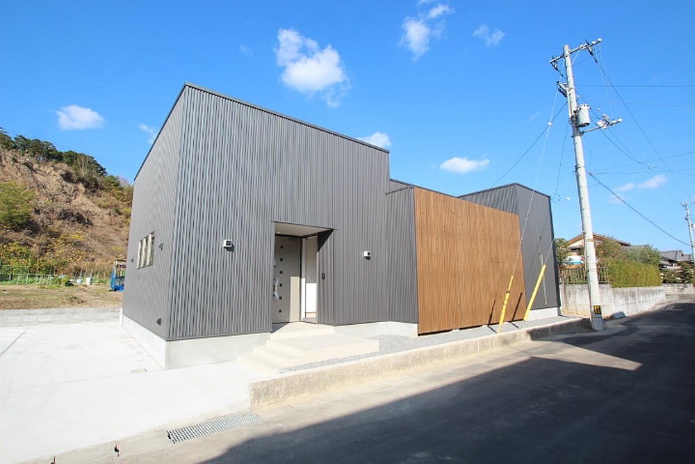 ▼ガルバリウムに縦格子が印象的な外観。