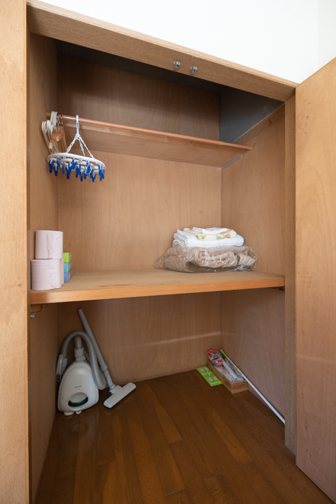 収納スペースには掃除機、洗濯用品など入っています